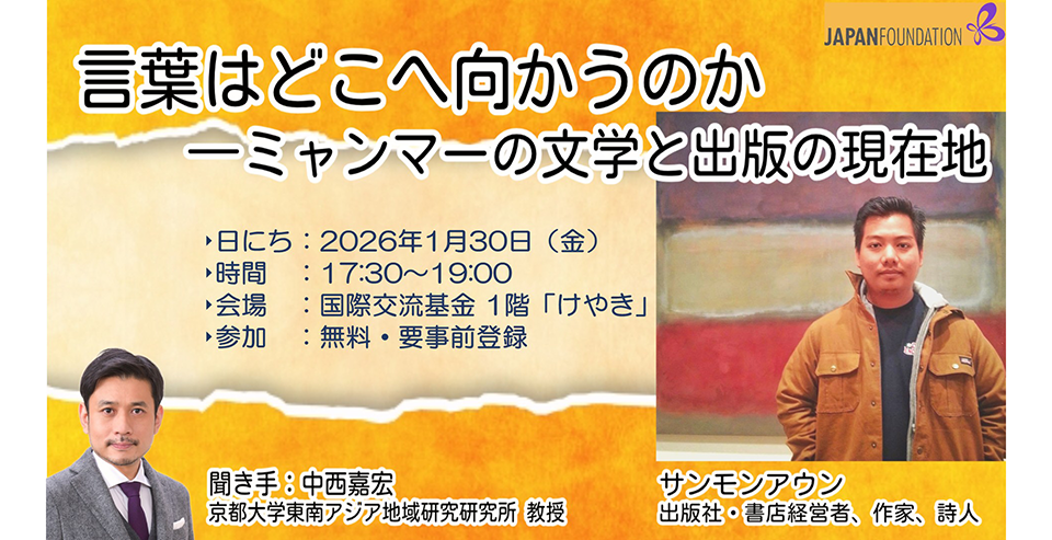 2026. 01. 30(金) 文芸対話プロジェクト“YOMU”トークセッション 「言葉はどこへ向かうのか—ミャンマーの文学と出版の現在地」 日本 関係する国 ミャンマー 国際対話 Tweet 事業の詳細はJF本体サイトに掲載しています。 JFサイト 文芸対話プロジェクト“YOMU”トークセッション「言葉はどこへ向かうのか—ミャンマーの文学と出版の現在地」 Tweet