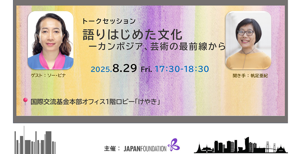 2025. 08. 29(金) 文芸対話プロジェクト“YOMU” 報告『語りはじめた文化 ― カンボジア、芸術の最前線から』 日本 関係する国 カンボジア 知的交流 国際対話 Tweet 事業の詳細はJF本体サイトに掲載しています。 JFサイト 報告『語りはじめた文化 ― カンボジア、芸術の最前線から』 文芸対話プロジェクト“YOMU” Tweet