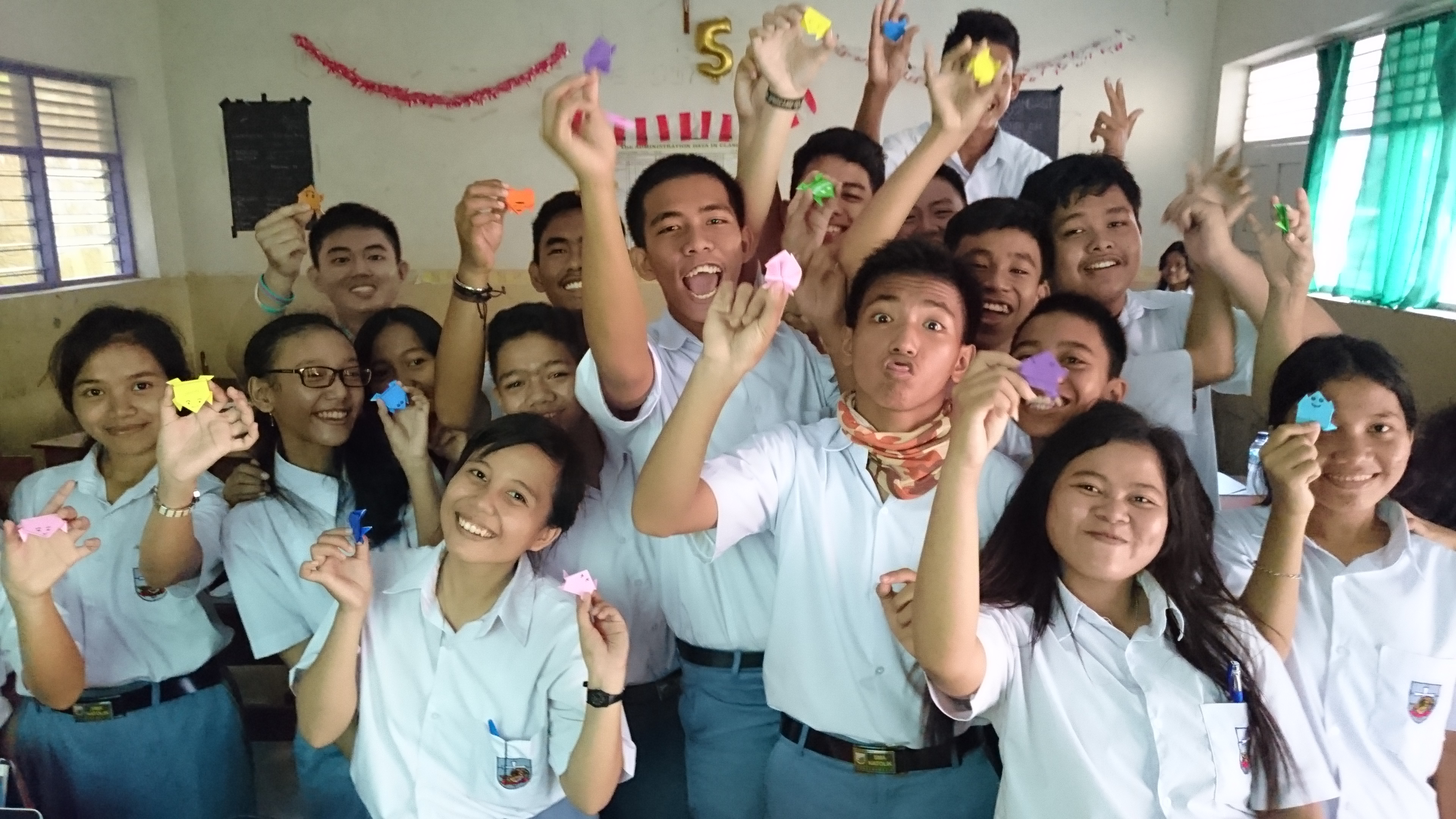 作品説明:高校一年生のクラスで、折り紙の文化紹介をしました。自分で折ったカエルを持って記念撮影。折り紙を折るのも、写真を撮るのも賑やか。でも、中には写真に写るのを恥ずかしがる子もいました。私は、あなたの笑顔も覚えてるよ。