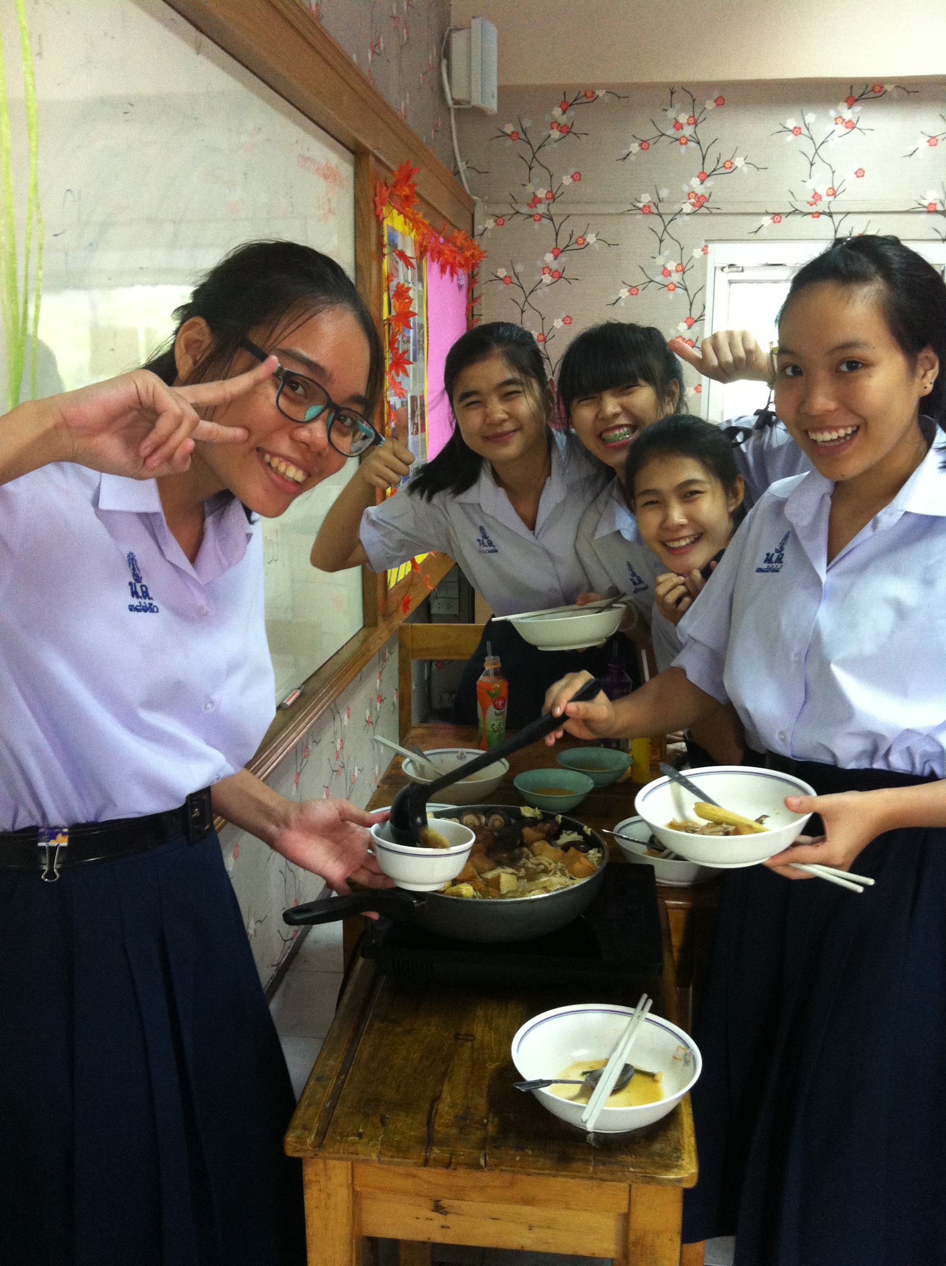 作品説明:M5(高校2年生)のクラスで「すきやき作り」の体験授業を行いました。生徒が食材を集め、日本語とタイ語で説明しながら一緒に作ってみました。生徒は皆日本料理が大好き。このキラキラした笑顔で分かるように、初めて自分たちで作ったすき焼きに大興奮。
