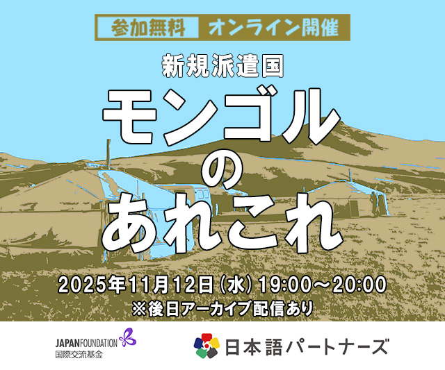 ・当日はモンゴルの現地事情や日本語教育事情についての説明を優先するため、事前に日本語パートナーズの募集情報ページや事業紹介動画等をご覧いただいてから参加されることをおすすめします。