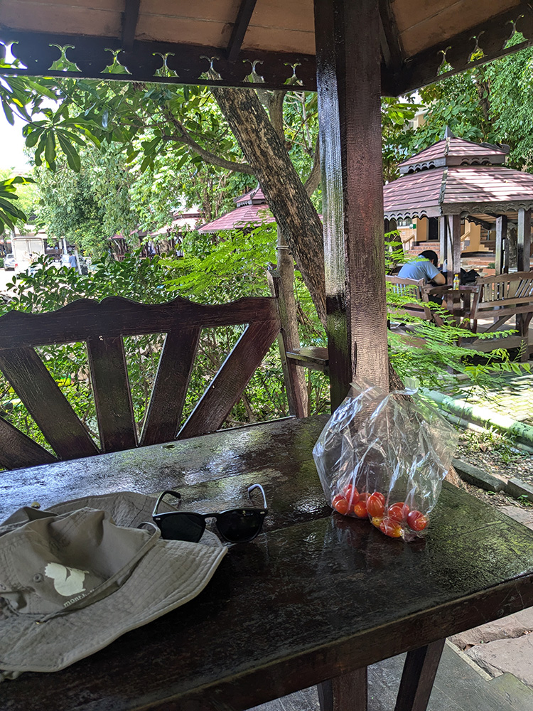 私の派遣先校内には木がたくさん植えられていて、大きな木の下には木製のサーラー(東屋)が20基あります。お昼休みや放課後には生徒たちが、友達とおしゃべりしたり、リラックスした姿で思い思いにのんびりした時を過ごしています。私も空き時間等に、そこでタイティー(練乳入りのオレンジ色の紅茶)やコーヒーを飲んだりします。心がゆったりして落ち着く、私のお気に入りの場所です。