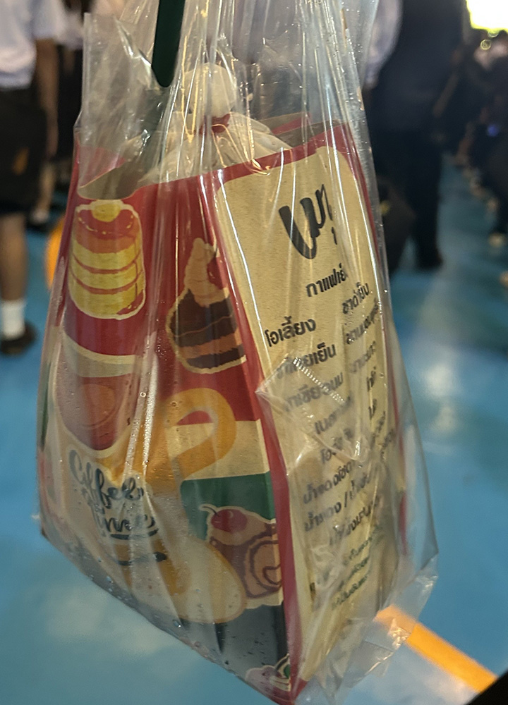 さらにタイらしいのが入れ物です。ビニール袋にドリンクを注ぎ、紙袋で包んでストローをさして飲みます。保冷が効きますし、持ち歩くのも可愛いです。