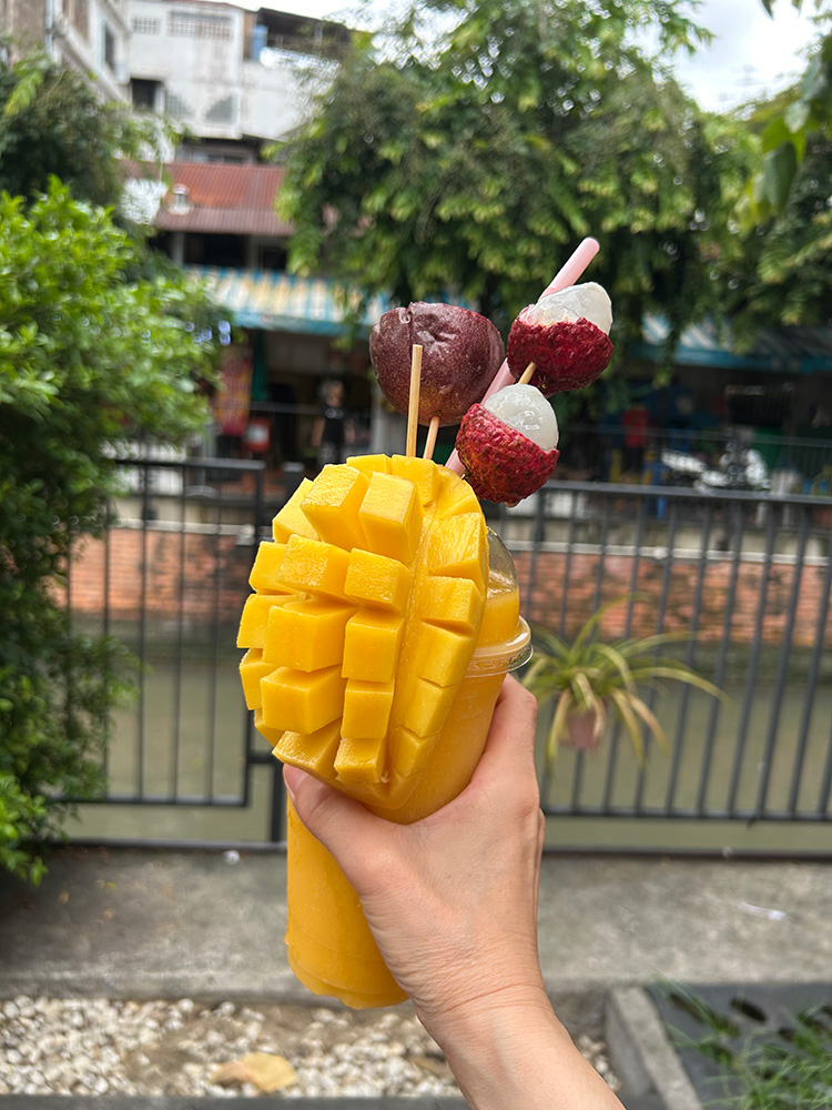 一番印象に残っているのは、先生に連れて行っていただいたサンペン市場(バンコクにあるローカルマーケット)近くのお店のマンゴースムージー。大きなカップにたっぷり入って、なんと50バーツ(約230円)!マンゴーだけでなく、パッションフルーツやライチまでトッピングされ、その豪華さに驚きました。