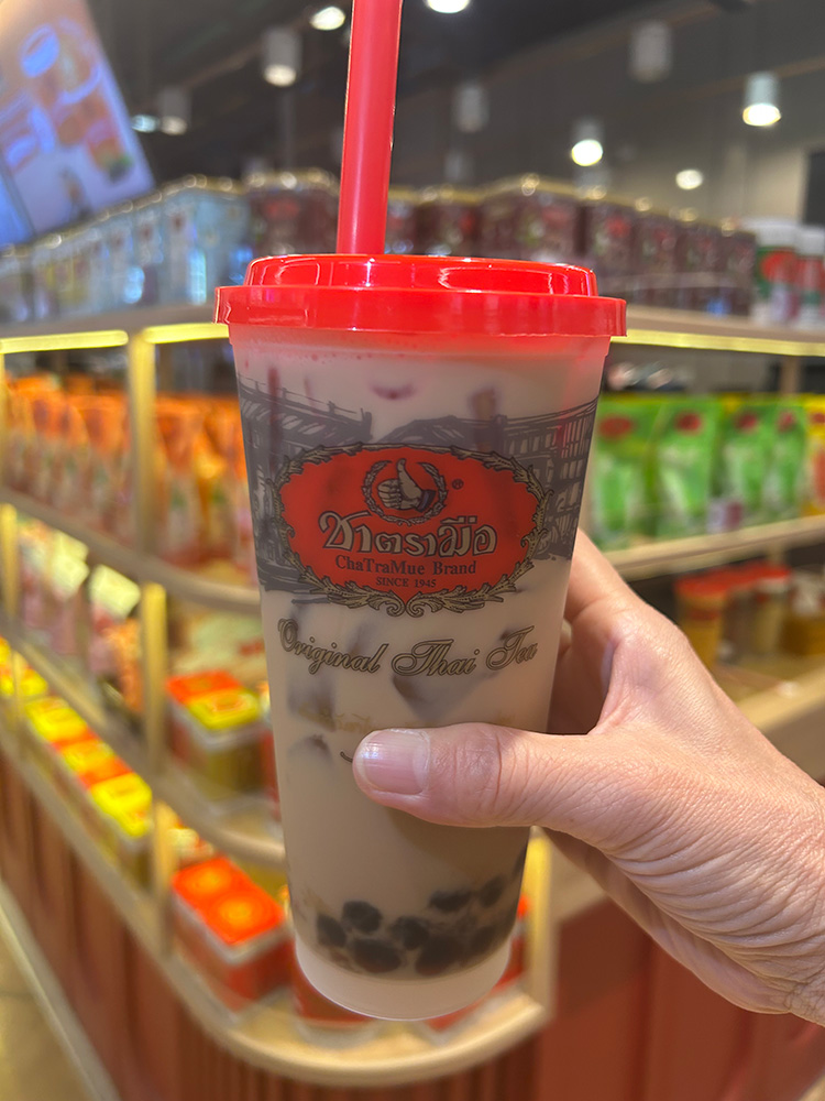 まずは定番の「チャータイ(タイの伝統的なミルクティー)」。濃く抽出した紅茶に練乳や砂糖を加えた甘くてコクのあるアイスミルクティーです。紅茶とミルクが混ざり合った鮮やかなオレンジ色は、チャータイならではの魅力だと思います。最近は着色料不使用の天然色のタイティーも登場していて、私はそこにカイムック(タピオカ)を入れるのが特に好きです。