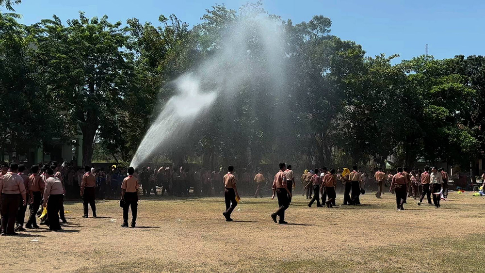 翌朝は、カレーを食べた後、消防士に来てもらい消防訓練をしました。火災が発生した時の初期消火の仕方や放水訓練も行いました。