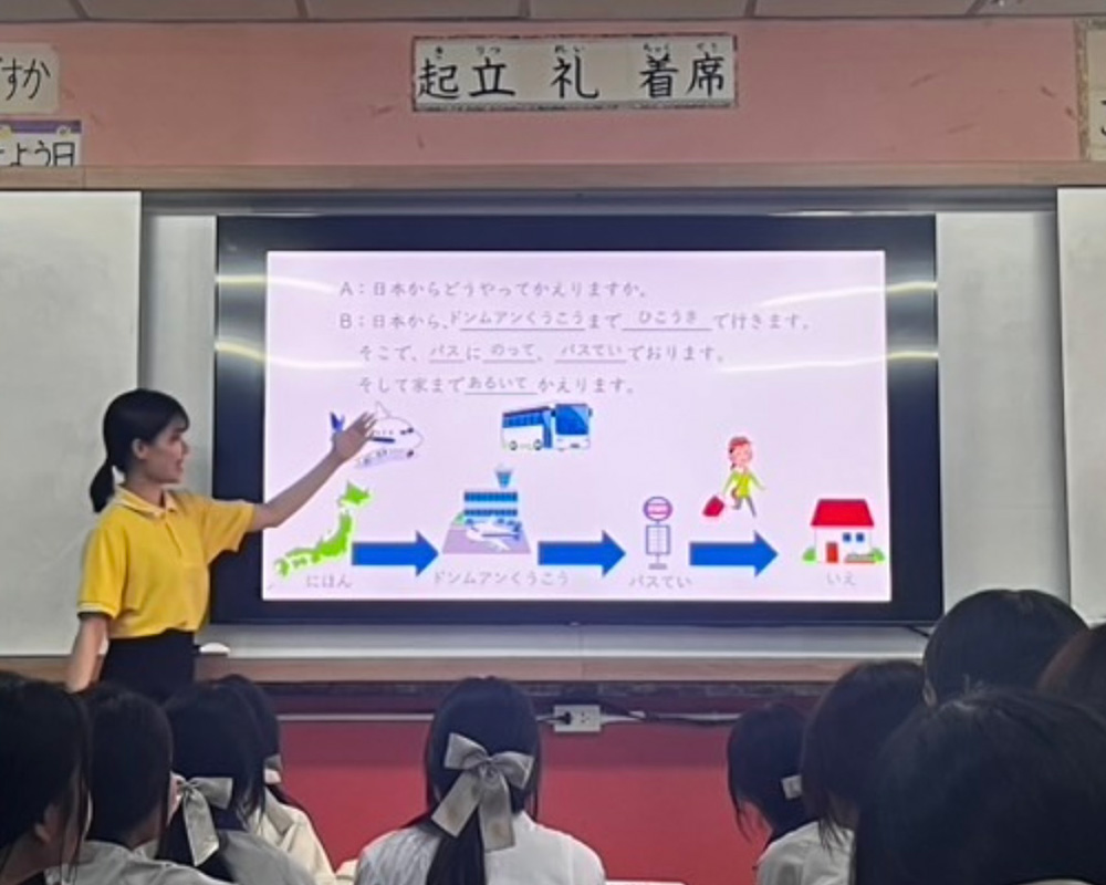 CP先生(現地の日本語の先生)と協力してチームティーチングを行います。私の役割は発音モデルや会話モデル、漢字や文法練習をサポートすることです。基本的に授業はCP先生主導で行いますが、漢字の授業の際はNPがメインとなって行います。CP先生たちはとても授業が上手で、生徒たちはとても楽しんで学んでいるのがわかります。私もCP先生たちのように生徒たちの興味を引くような伝え方ができるよう日々試行錯誤しています。