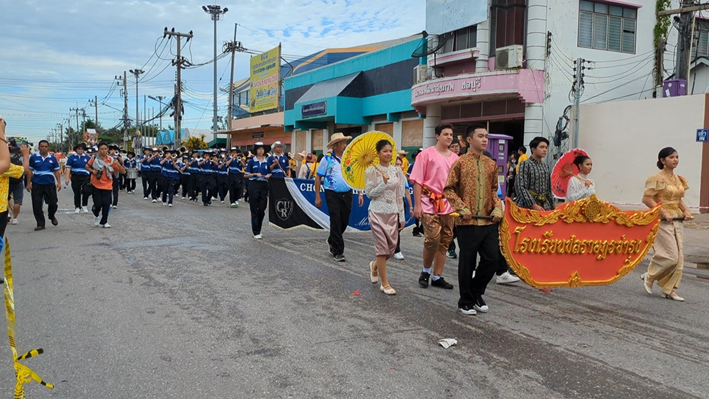 パレードは10月6日の8時から行われました。初めて見る大きな水牛とその角の立派さに感動しました。装飾された水牛や、鮮やかなタイの伝統的衣装を着た人たちが行進しました。私の派遣されているチョンラーサドーンアムルン校もパレードに参加しました。マーチングバンドが行進し、学校で作ったきれいに彩られた「水牛の山車」と生徒たちも行進しました。