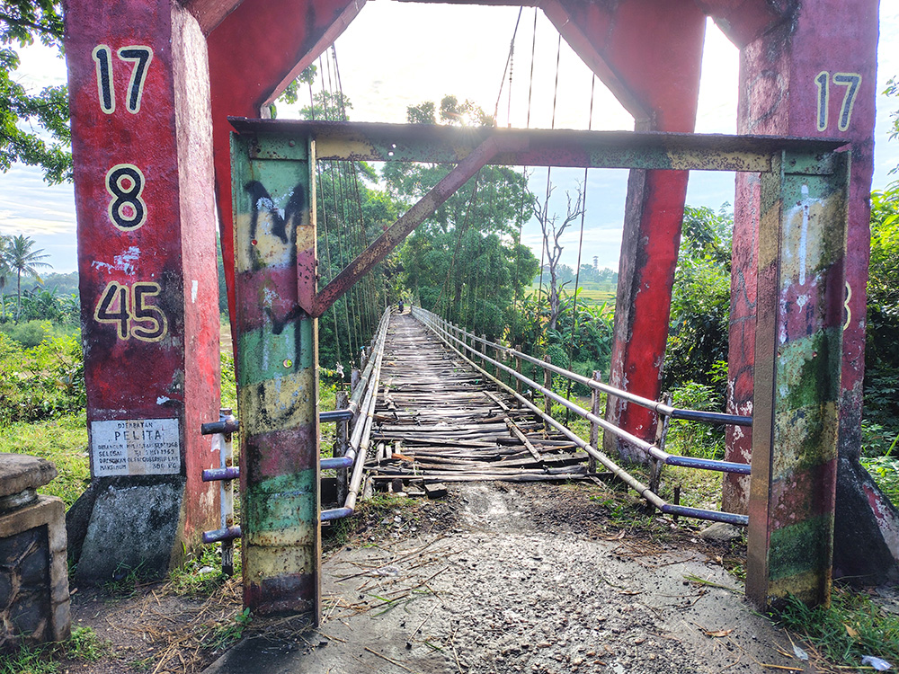 橋の名前は「PELITA(プリタ)」。インドネシア語で「灯火(ともしび)」という意味を持ちます。この吊り橋は1969年に完成し、全長およそ100メートル。車は基本的に通れず、地元の人々が主にバイクで行き来しています。