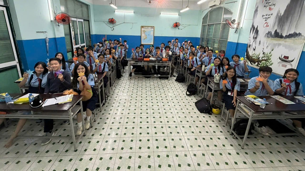 授業では、はじめにお月見についてやさしい日本語で紹介しました。CP先生がベトナム語で補足してくださり、生徒たちの理解が深まっていたように思います。クイズでは、徐々に難しくなる問題に挑戦しながら、日本のアニメや漫画での知識をヒントに答える生徒もいて、教室は大いに盛り上がりました。