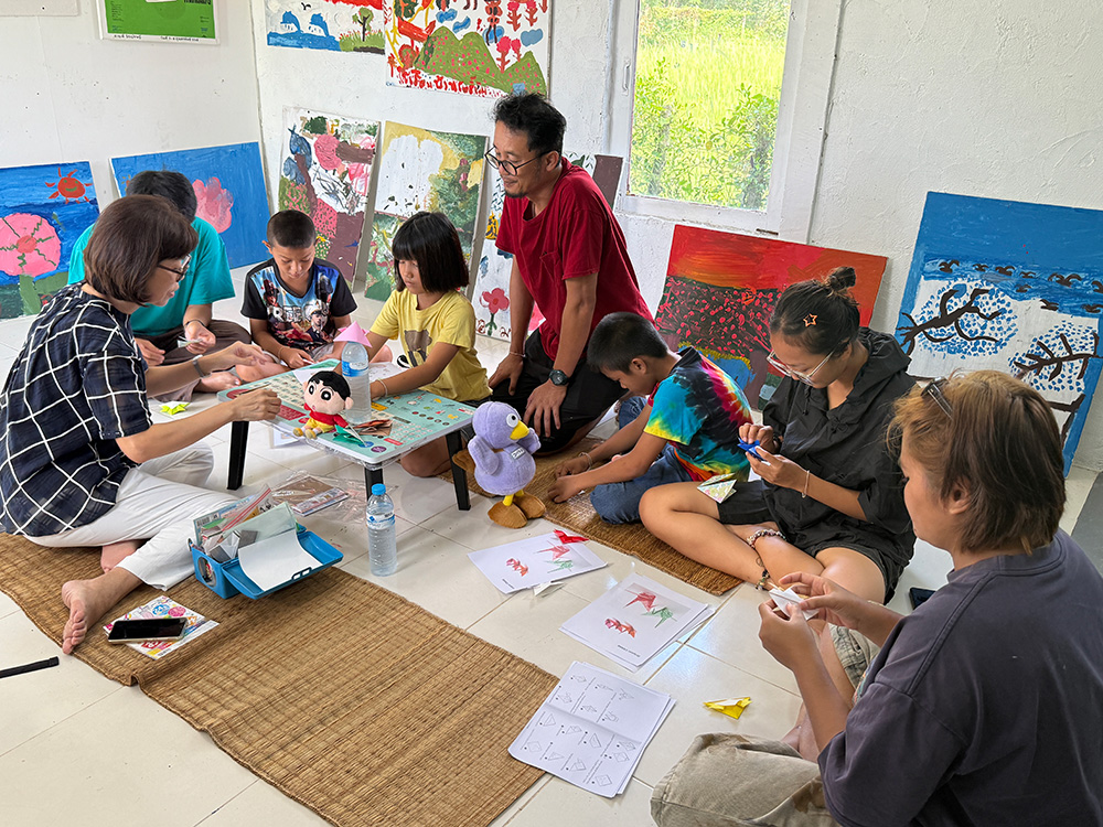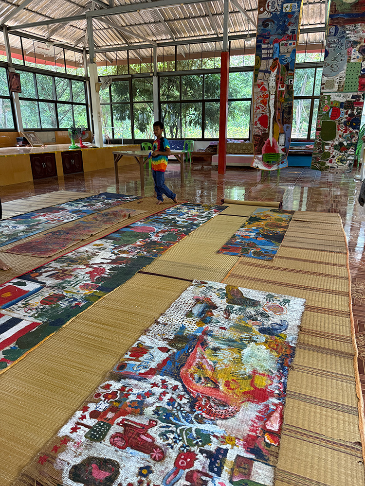 バスターミナルまで迎えに来ていただき向かったそこは、田んぼの真ん中の秘密基地。かわいい小学生も待っていてくれました。イサーン(タイ東北部)のアートをもっと発信したいと、アーティストのガイさんはじめ、日本人プロデューサーも関わって立ち上げている場所です。近くの荒れていたお寺も、掃除から始めて子どもたちのアートでいっぱいにし、ほかのお寺にはないような姿で生き返らせていました。