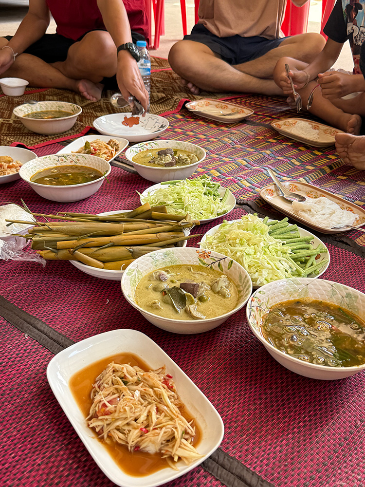 子どもたちと一緒に折り紙を折った後、コミュニティセンターに移動。そこには現地の奥様方が待っていてくださいました。食べきれないほどの本格イサーン料理をごちそうになりましたが、そういえばソムタム以外はさほど辛くなく、ぱくぱく食べられました。きっと皆さんには物足りないでしょうに、私たちに合わせて作ってくれたのです。
