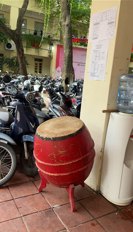 派遣前に1か月研修を受けた際に、この太鼓の存在を知りました。最初はどこから太鼓が聞こえてくるのか分からなかったのですが、守衛室前で実物を見つけた時「これか!」と嬉しくなりました。
