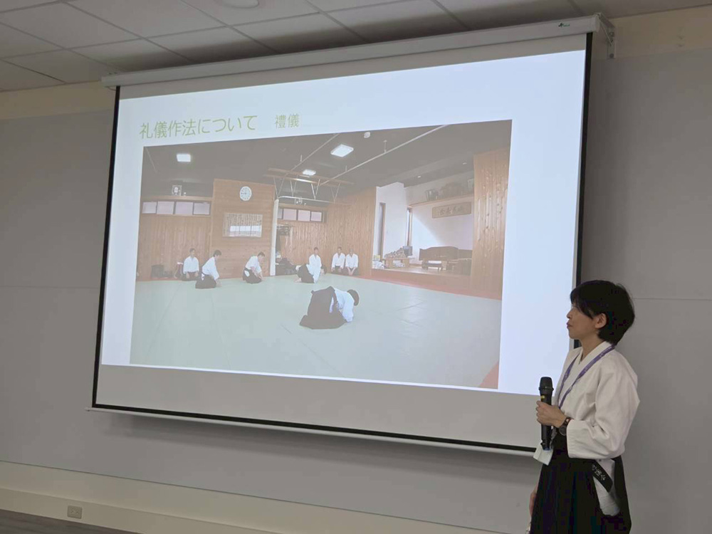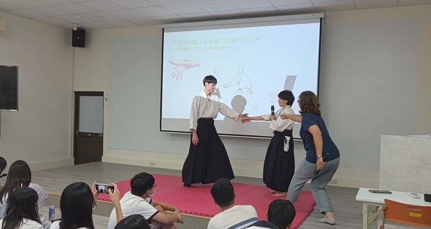 私は長年日本で合気道をしていたので、ぜひ台湾の高校生たちに合気道を紹介したいと思っていました。国立善化高等学校では、1つの授業は2コマ(1コマ50分授業)で行います。まず、最初の1コマでスポーツと武道の違いや礼儀作法、合気道の特徴等を説明し、合気道に関連するアニメや動画等を観てもらいました。