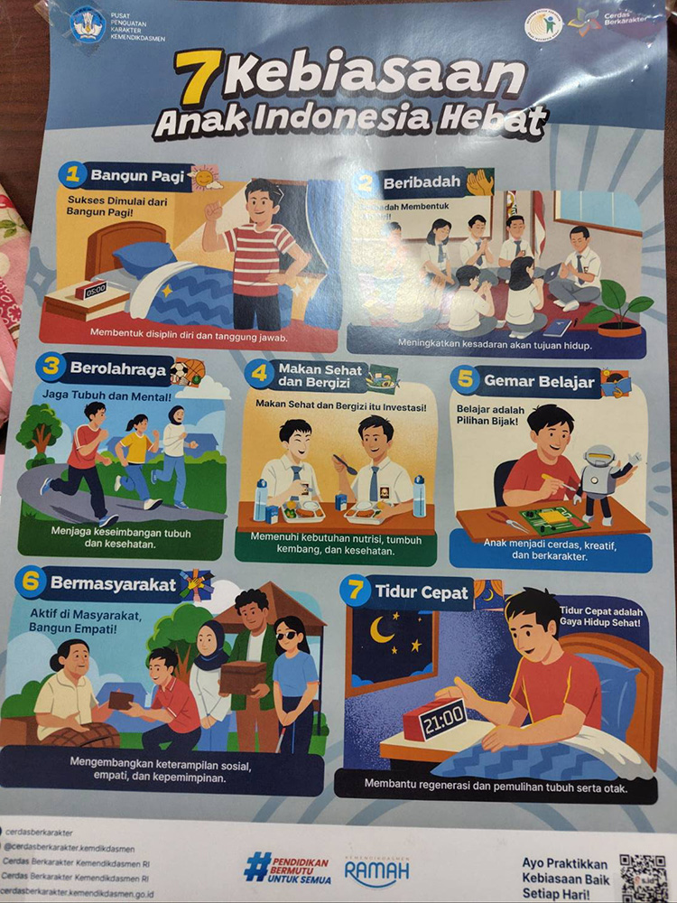 実はこのTALENTAは、今年の7月に始まったばかりの新しい取り組みで、インドネシア政府が推進する「7 Kebiasaan Anak Indonesia Hebat(優れたインドネシアの子どもたちを育てるための7つの習慣)」の目標を達成するための一環として実施されています。この運動では、Bangun Pagi(早起き)、Beribadah(礼拝)、Berolahraga(運動)、Makan Sehat dan Bergizi(健康で栄養のある食事)、Gemar Belajar(学びを楽しむ)、Bermasyarakat(地域社会との関わり)、Tidur Cepat(早寝)という7つの良い生活習慣を身につけることを目指しています。