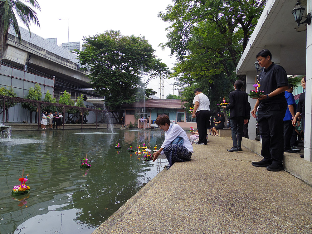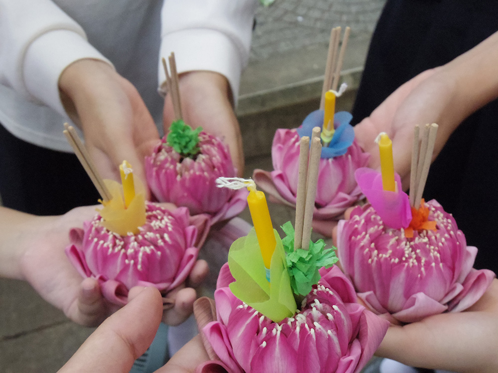夜は先述の公園に、生徒とともに行きました。驚くほどの人出で、クラトンを池に浮かべるには行列に並んでしばらく待たなければなりませんでした。クラトンはいろいろな大きさや形のものが売られていました。日本で灯篭流しをしようと思っても、こんなに身近には催されていません。バンコクの街中でもいろいろな場所で開催されているロイクラトンはタイの人にとって大切な行事だと感じました。