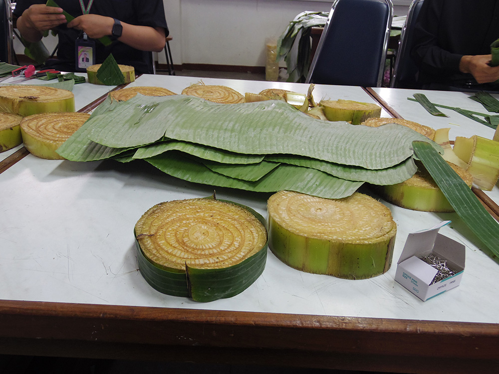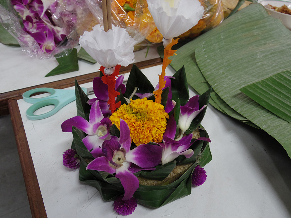 11月4日、ロイクラトンの前日に、派遣先校でクラトン作りをしました。放課後に、ほかの先生方とともに家庭科の先生に教えていただきながら作りました。バナナの茎を土台にしてバナナの葉を形作り、巻いたり載せたりしました。花を飾って、最後はロウソクと線香を立てて完成です。バナナの葉をたたむのは日本の折り紙の要領によく似ています。しかしあまりうまくいかず、こじんまりしたものとなりました。