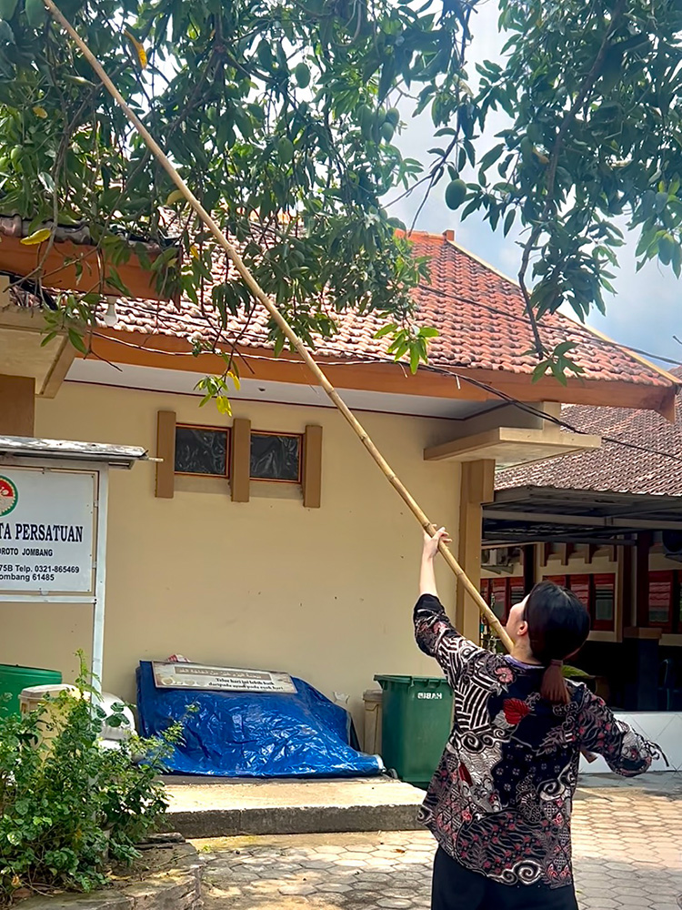 収穫用の竹の棒に切れ込みが施されているので、その切れ込み部分に枝を入れて、棒を回すと収穫できます。枝が千切れて枝ごと収穫する形になったり、突然果実だけが落下したりするため、いつどう採れるかが分からずドキドキしました。採ったばかりのマンゴーの実にナイフを入れて、いざ実食。