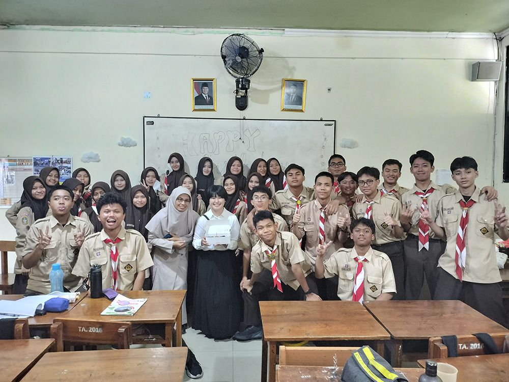 また、お祝いは先生方からだけではありませんでした。授業に行くと、何だか生徒がソワソワしています。そして出席を取ると、なぜかトイレに行っている人が多いのです。しかもいつもならCP先生は、生徒が日本語で「トイレ」と言わないと注意するのに、今日は「Kamar mandi(インドネシア語で「トイレ」の意味)」と言ってもスルー。