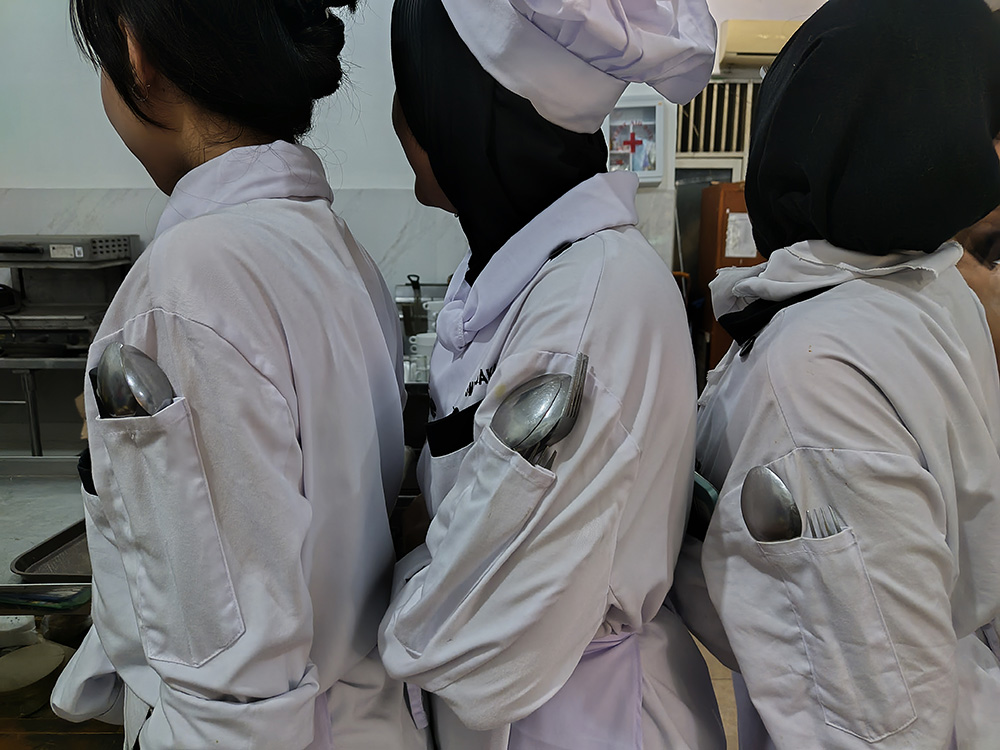 左袖の肩下にスプーンやフォークを入れるポケットがついています。味見等をするときに便利なのだそうです。