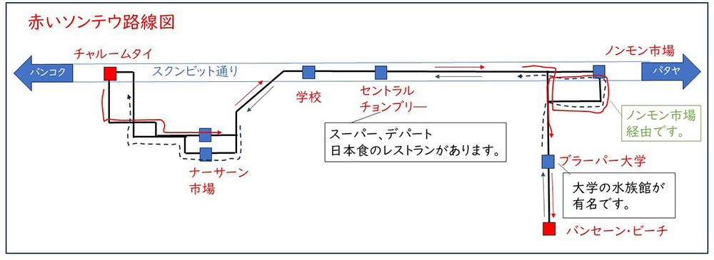 チョンブリーに着任した日にCP先生(現地の日本語の先生)からソンテウの乗り方を教えてもらいました。降り方が難しく、降りたい場所の100メートル位前にブザーを押すように言われました。ブザーが壊れていた時があり、焦って運転席の窓を叩いて知らせたことがありました。なお、このような時はほかのブザーを押せばよいそうです。登校時は7時前に赤いソンテウに乗ります。この時間はソンテウがたくさん走っていて、待ち時間がほとんどありません。「山手線より便利かも!」が私の感想です。