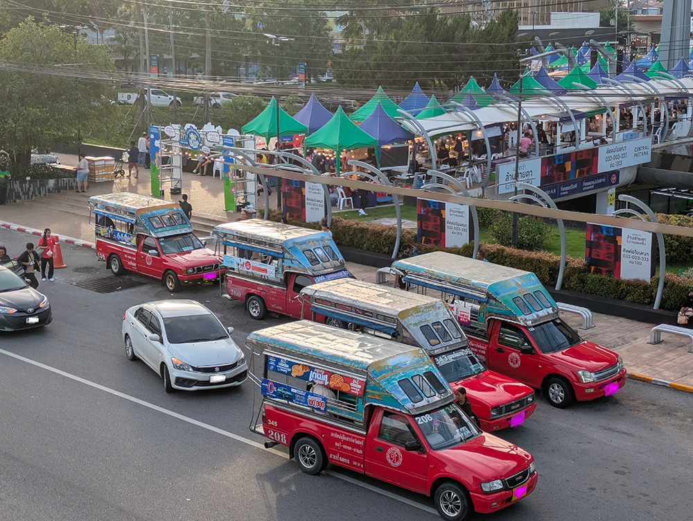 「チャルームタイ」の交差点は五差路になっており、交通の要所です。ここを起点に複数のソンテウやロットゥー(乗合バン)が出ています。