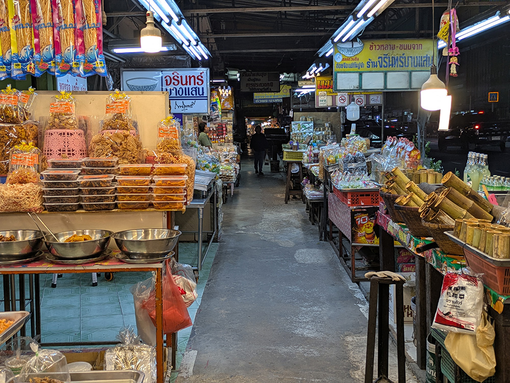 「ノンモン市場」はカオラームで有名です。カオラームはカオニャオ(蒸したもち米)とココナッツミルク、小豆等を竹筒に詰めて蒸し焼きにしたタイの伝統的なスイーツです。海鮮の乾き物やドリアンチップスも買うことができます。