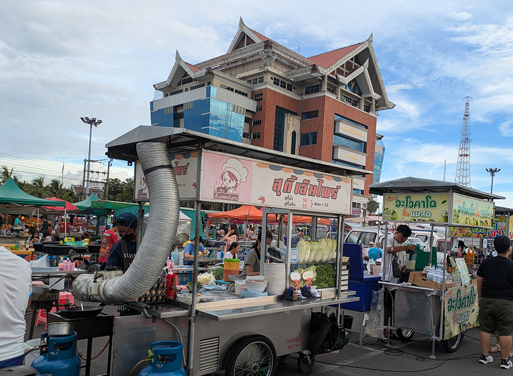「ナーサーン市場」は訳すと「裁判所前市場」です。普段は16時過ぎから食べ物の屋台が開き始めます。CP先生に教えてもらったタイスキ(タイ風すき焼き)の屋台がお気に入りになりました。この場所で毎年10月の満月前の1週間位の間に水牛祭りが開催されます。