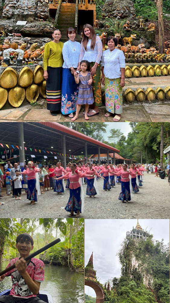 2日目は、先生のお母様が用意してくれたタイ南部の伝統服を着てお寺へ。ちょうど年に一度のタンブン(タイの伝統的な仏教行事)が行われていて、とても賑やか!タイの文化を肌で感じられてうれしかったです。