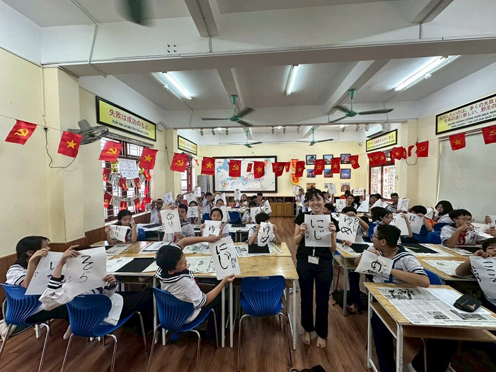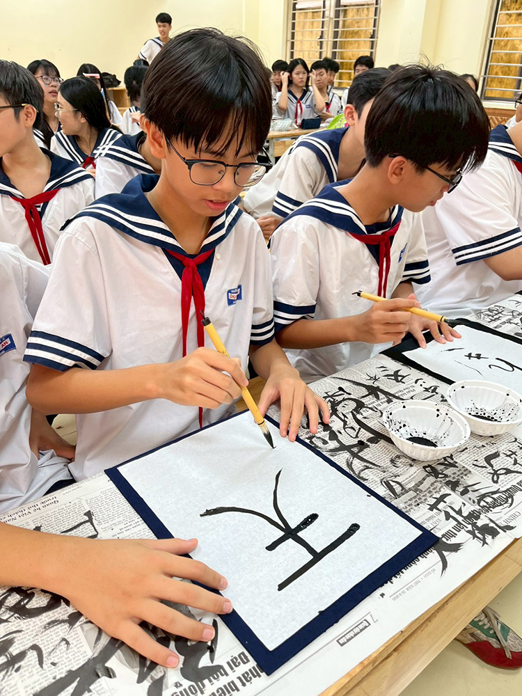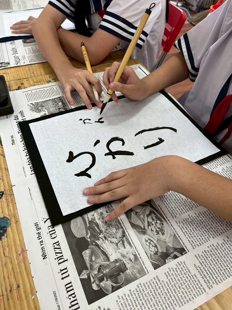 書く言葉は、自分の好きな日本語や自分の名前等、思い思いの一文字です。でき上がった作品を発表する時間には、「どんな言葉を書いたの?」とお互いに興味津々。緊張しながらも、一生懸命に説明する姿がとても印象的でした。そして最後は一緒に後片付け。日本では、使った道具をきれいに整えることも学びの一つだと伝えると、生徒たちはすぐに行動に移し、新聞紙をまとめたり、道具を戻したりと、協力しながら気持ちよく終えることができました。