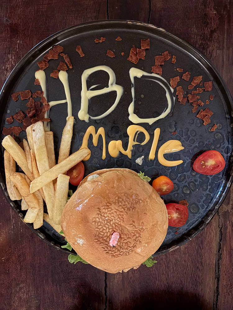 お店に到着し、しばらくご飯を楽しんでいると、先生たちの視線の先にろうそくの光と新しいプレートが。誰のお祝いだ?と思っていたら、店員さんがまっすぐ私の方へ。なんと先生方がサプライズで用意してくださった誕生日プレートでした!思いがけないお祝いに胸がいっぱいになりました。