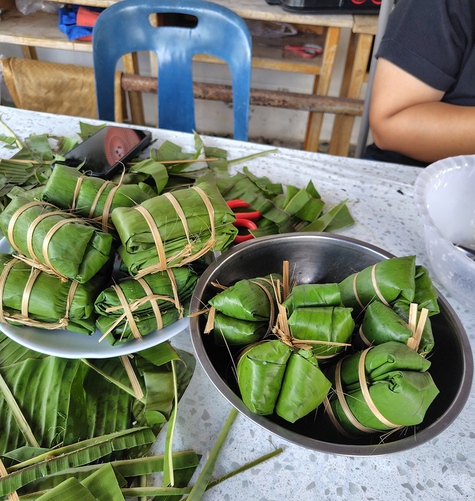 最近、CP先生(現地の日本語の先生)に誘っていただいて、お料理上手な同じ学校の数学の先生のお家でタイの定番おやつ「カオトムマット(もち米とバナナの蒸し菓子)」を作りました。バナナの葉に生のもち米とバナナを置いて包み、竹ひもで縛って蒸し上げます。バナナの葉は少し火で炙ると柔らかくなるんですよ!腹持ちの良いおやつです。