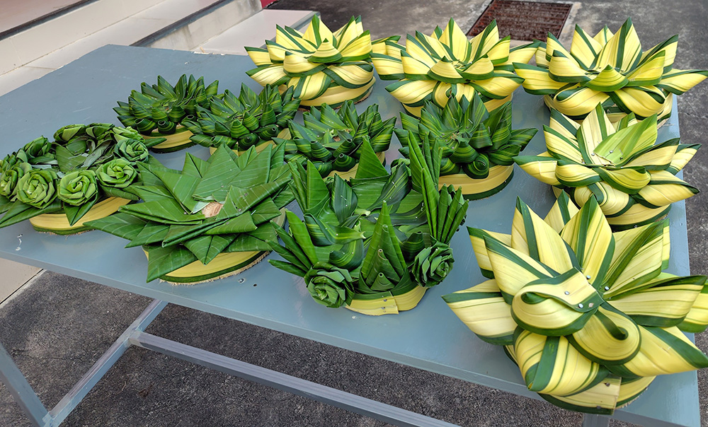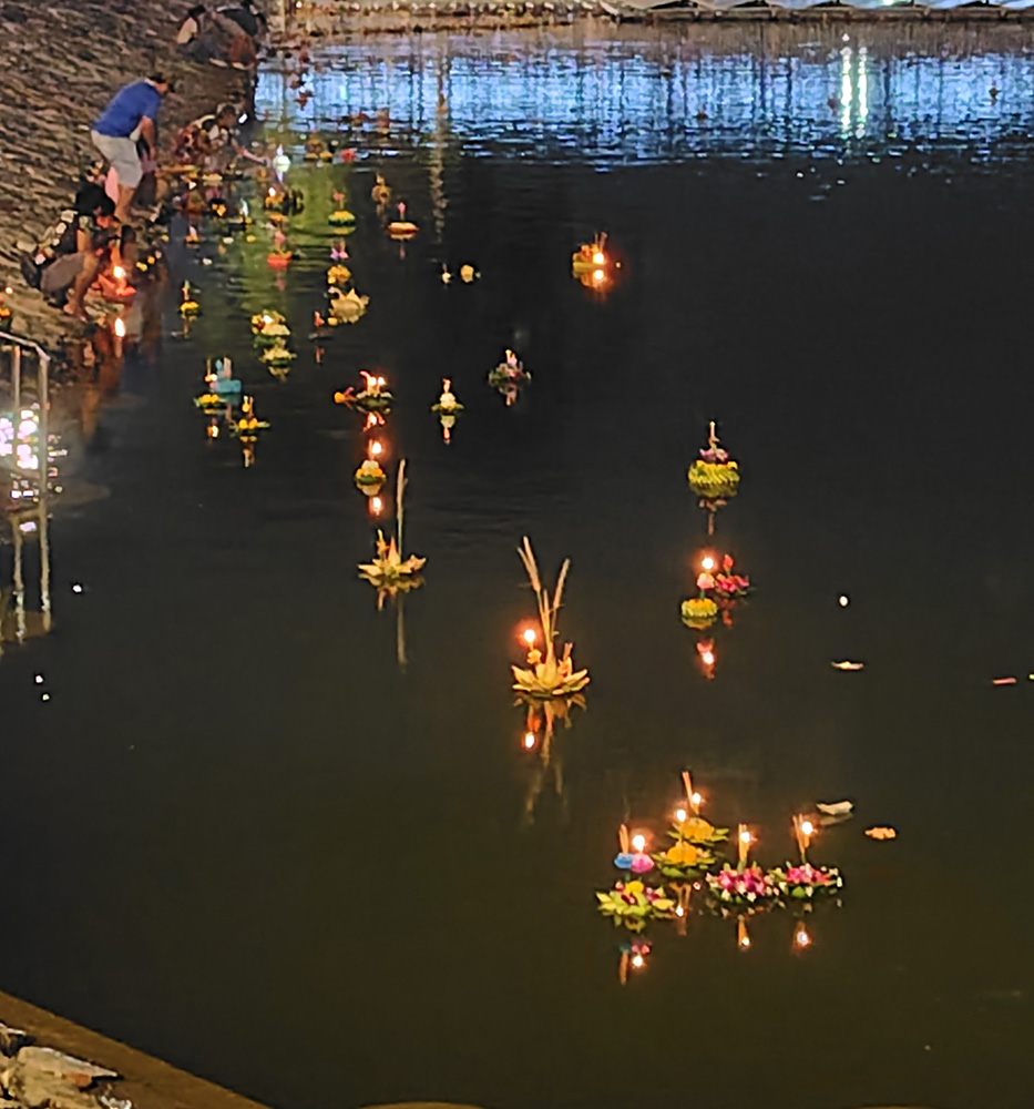 そしてロイクラトン祭り。10月末~11月頃の満月の夜に行われるお祭りです。灯篭を川に流すことで水の神に感謝するそうです。灯篭は、バナナの幹を4~5cmほどに輪切りにしたものを土台にし、バナナの葉で周りを飾り、中央にお花とろうそくを置けばでき上がり。タイには年中沢山の種類のバナナがありますが、食べて良し、包んで良し、飾って良しなので、大活躍しています!幸運にも派遣先校のそばでこのお祭りがありました。前日に寮で灯篭作りを教えていただき、翌日お花を飾って先生、生徒たちと流しました。素敵な夜になりました!
