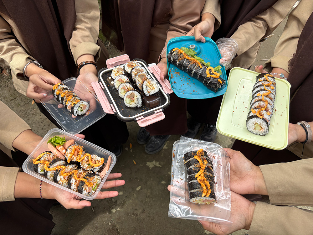 2つ目の文化紹介は「巻き寿司づくり」です!これは一番反響が大きかった活動といっても過言ではありません。道具は私や現地の日本語の先生が用意しましたが、ごはん・のり・具材は生徒が準備しました。生徒の忘れ物がないか少し心配していましたが、当日は全員がやる気に満ち溢れていて、無事に成功することができました!寿司や日本の食文化について説明した後、生徒たちは協力しながら自分たちのオリジナル巻き寿司を作りました。生徒たちは巻き寿司の写真を撮ってSNSに投稿する等しており、日本文化がさらに広がっていくのを感じました!