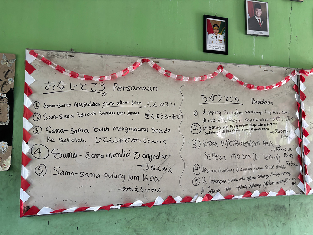 最初の文化紹介は「わたしの高校生活」でした!実際に私が通っていた高校の写真を使いながら、制服や教室、時間割表等を見て、生徒と一緒に日本とインドネシアの高校生活の「同じところ」「違うところ」について考えました。ペアで意見を共有した後、黒板に書き出してもらうと、たくさんの興味深い発見がありました。