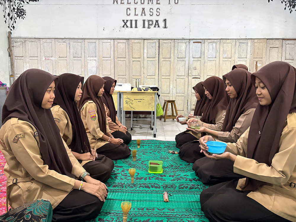 最後は「茶道」です!インドネシアでも抹茶は人気で、カフェ等で気軽に飲むことができますが、今回は“本格的な抹茶”を体験してもらいました。実際に正座をして、作法を意識しながらお茶を点てることができました。茶菓として持ってきてもらった甘いお菓子もそれぞれ個性があって、とても面白かったです!
