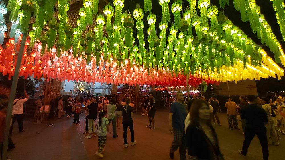 サラークヨームが終わると、ワット・プラ・タート・ハリプンチャイでは「10万灯篭奉納」が始まり、境内には多くの灯篭が飾られます。参拝者は灯篭を購入し、願いごとや名前を書いて吊るします。灯篭の色は生まれた曜日によって決まっていて、私は火曜日生まれなのでピンク色の灯篭を選びました。願いごとを書いた後、仏塔の周囲を線香とろうそくを持って3周します。
