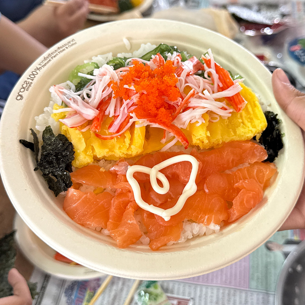授業ではまず、「ちらす」という言葉の意味や、ちらしずしを食べる理由等を説明しました。その後は、みんなで酢飯を作り、一人ひとり盛り付けをしてオリジナルのちらしずしを完成させました。具材は生徒自身に準備してもらったのですが、のりや卵、エビといった定番のほかに、ソーセージやふりかけ、さらにはインスタント麺を使う生徒もいて、自由な発想に思わず笑顔になりました。出来上がったちらしずしを前に、生徒たちは「いただきます!」「おいしい!」と楽しそうに食べていました。その様子を見て、私自身も幸せな気持ちになりました。