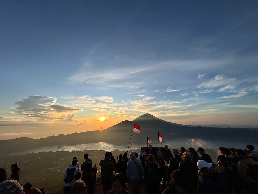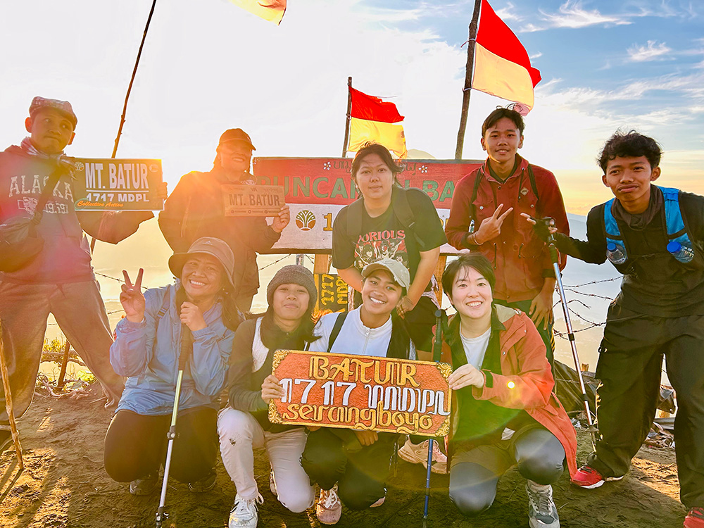 先ず、バリ派遣が決まったころから憧れていた世界遺産のバトゥール登山です。派遣先校で仲良くなった先生が登山好きの方で、先日、先生数人と生徒の有志で憧れのバトゥール山へ朝日を見に行って来ました。まだ空が暗い頃から登り始め、片道2時間ひたすら薄暗がりの中を歩きました。空が明るくなってきたころ、頂上に到着しました。出発前には麓のお寺で道中の安全を祈り、道中も日本では見ないような片手拳くらいの大きさのカエルを見てびっくりし、人々は山頂にたどり着くまでバリヒンドゥーのお供え物“チャナン”を供え祈り、改めてバリの人にとって祈りとは日常の生活の中で切り離せない大切なものであると知りました。
