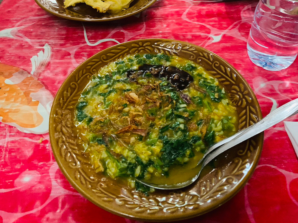 1つ目は、TinutuanとMiedalです。カボチャベースのおかゆにたくさんの野菜が入っており、野菜が不足しがちな私のインドネシア生活で、まさに「救世主」とよべる料理です。Tinutuanはお米だけ、Miedalはお米と麺が入っています。