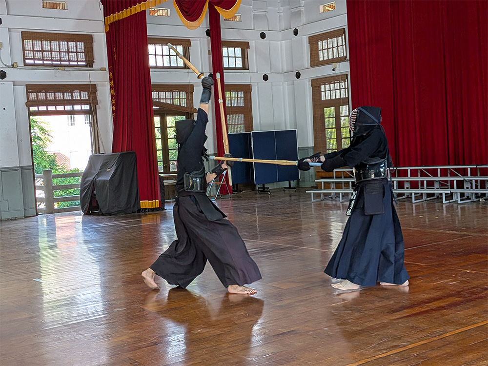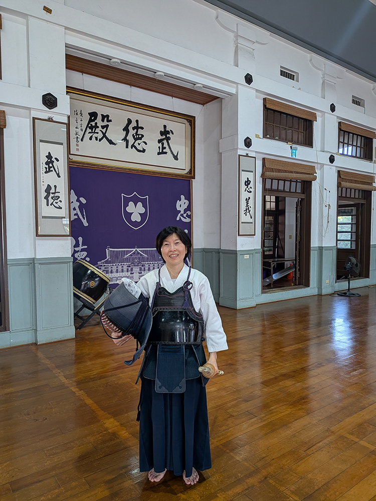 翌週、道着を抱えワクワクしながら武徳殿へ。ところがいざ稽古が始まると、まったく体は動かず、最初の素振りでフラフラです。見ているだけと実際にやるのとは大違いです。稽古についていくだけで精一杯でしたが、それでも皆さん最初から最後まで、丁寧に優しく指導してくださいました。本当に心から“謝謝您(ありがとうございます)!”です