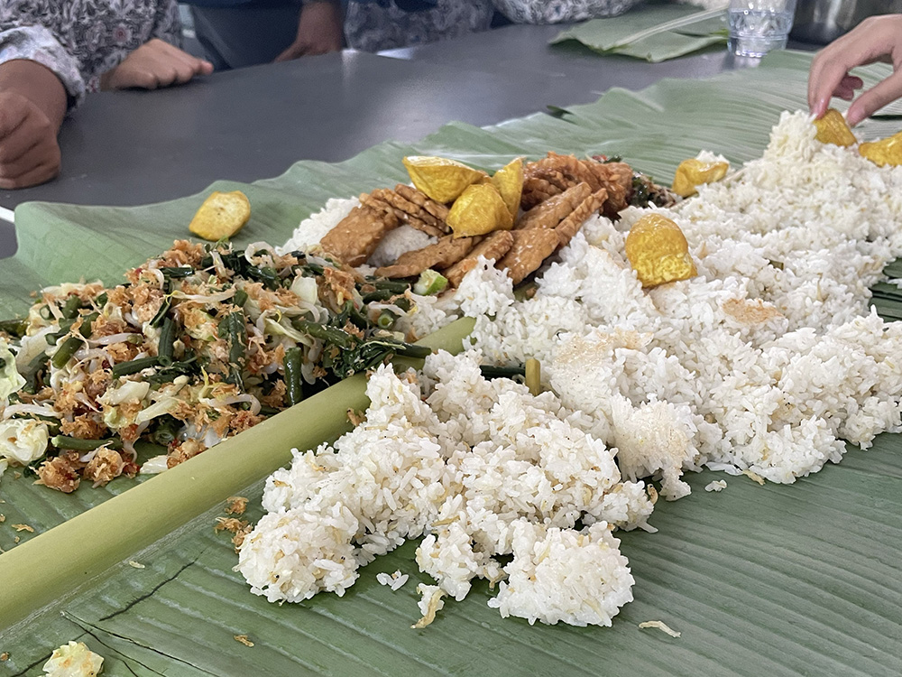 生徒の手際がとてもよく、チャキチャキと準備が進んでいきます。予想の70倍ダイナミックな、この食事スタイルは「リウェット」。同じ釜の飯……ならぬ、同じ葉っぱの飯を、手でモグモグ食べて、生徒との絆が少し深まった気がしました!