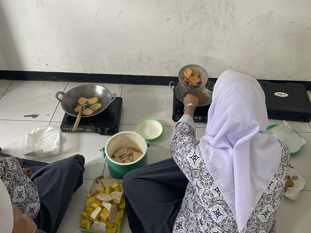 教室のホワイトボードの下、いつもプロジェクターをつないでいるコンセントには、炊飯器が3つ、つながれています。その横で、カセットコンロによる、テンペ(インドネシア発祥の大豆発酵食品)と豆腐の揚げ物がはじまりました。