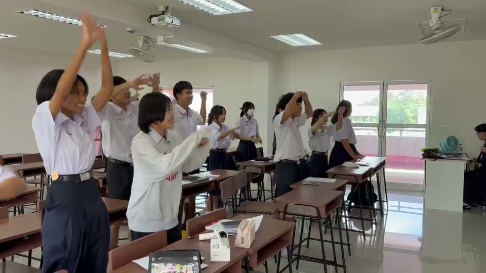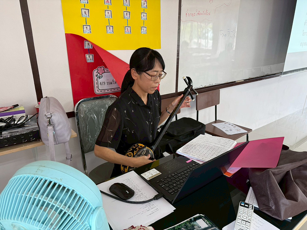 文化紹介では、まず日本の楽器の紹介をして、「箏」「鼓」「しょう」の音を聞いてもらいました。そして、タイに似たような楽器があるかを尋ねました。その後、三線の説明をしました。三線の歴史、弾き方、楽譜の特徴等を説明した後、三線の代表曲「安里屋(あさどや)ユンタ節(作詞星克・作曲宮良長包)」を聞いてもらいました。そして、「上を向いて歩こう(作詞永六輔・作曲中村八大)」をみんなで一緒に歌う練習をしました。この曲は、東南アジアで有名だということで、急遽選曲したのですが、生徒たちは知りませんでした。少し上の年代の方だったらわかってもらえたかもしれません。しかし、歌詞自体は簡単だったので、いっしょに歌うことができました。