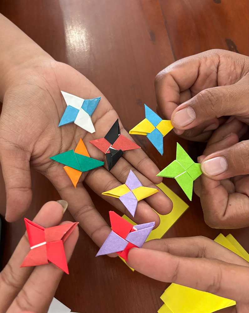 私はいつもおりがみを携帯し、交流のチャンスにはいっしょにおりがみをすることがよくあります。この日は生徒と手裏剣を作りました。日本のアニメに興味がある生徒もいるからでしょうか、私がおりがみの手裏剣を見せるとすぐに「しゅりけん!」と言ってくれました。「そうです!はい、そうです!作りましょう!」となりました。近くにいた生徒も興味を示してくれ、大勢で一つのテーブルを囲んで作ることになりました。現地の日本語の先生もいっしょに輪の中に入ってくださって、みんなでわいわいと色鮮やかな手裏剣を作ることができました。はじめて作ったと喜んで持って帰ってくれる姿に感激しました。