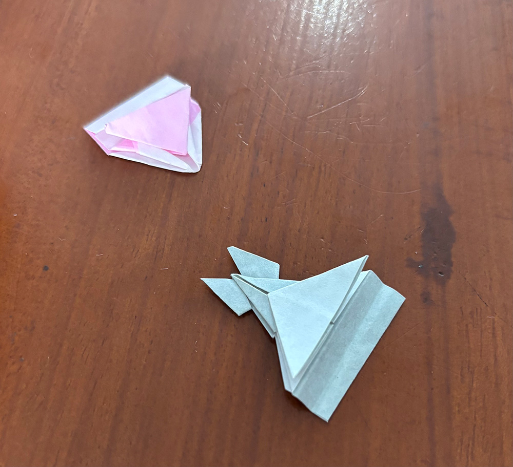 手裏剣作りの後、おりがみを作り続ける生徒もいました。すると、おりがみを使って生徒のなじみのある遊びが始まりました。船のようなものを作って、二人が向かい合います。そして、その作品に息を吹きかけて二人で対戦します。自分の作品をひっくり返すことなく、相手の作品がひっくり返ったら勝ちです。勝つためには作品の作り方も息の吹き方もポイントですね。おもわず、何度も挑戦したくなります。