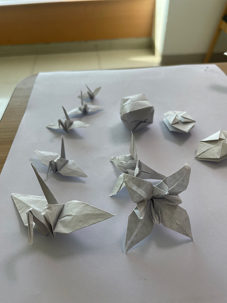 みなさんに少しでも楽しんでもらおうと、食事の時のカトラリーの袋で折り紙を折って並べておいて、好きなものを差し上げると、とても喜んでもらえて、こちらまで嬉しくなります。