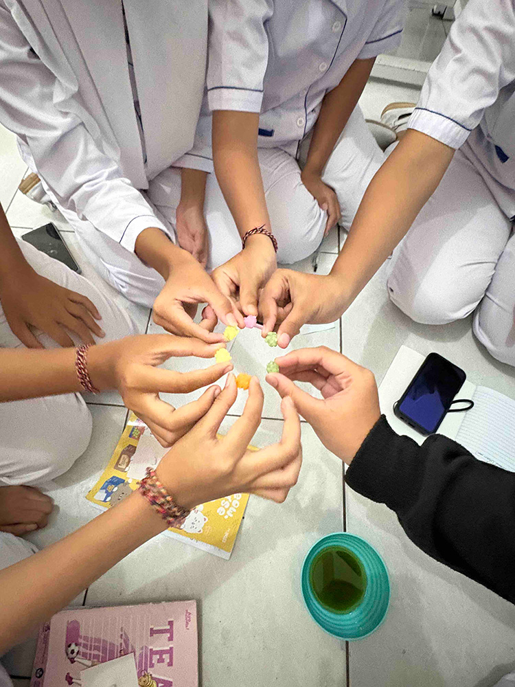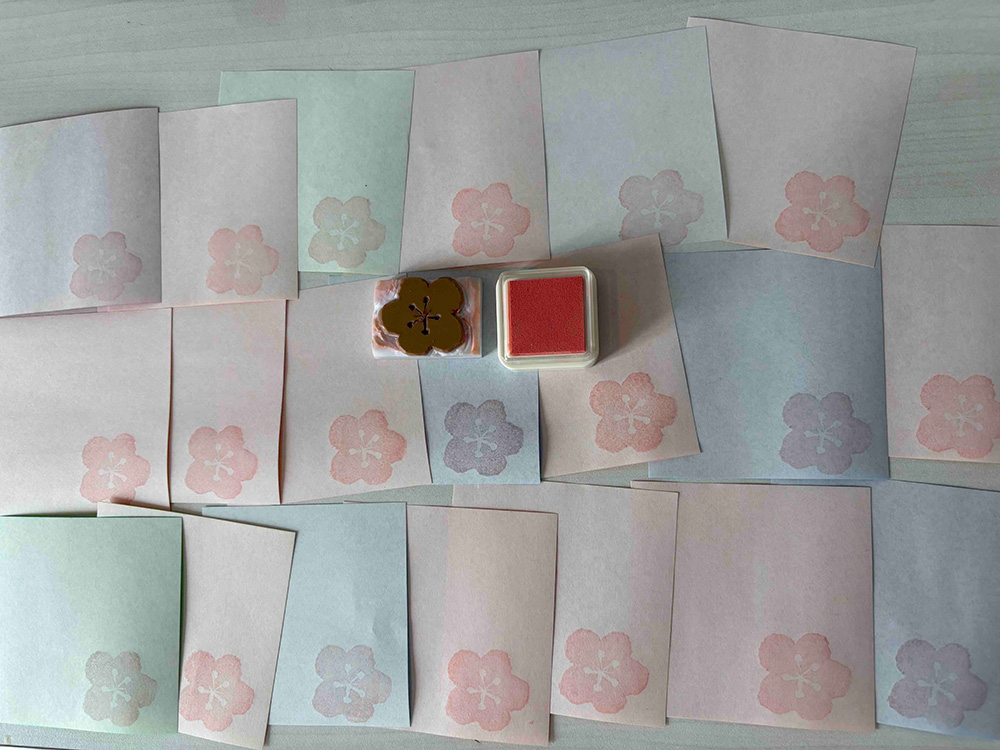 生徒には、茶碗と任意で好きなお菓子を持ってきてもらいました。私は日本で調達した金平糖をみんなに配りました。お菓子を置くための懐紙には、消しゴムはんこで作った梅のスタンプを押しました。私なりのおもてなしの気持ちです。