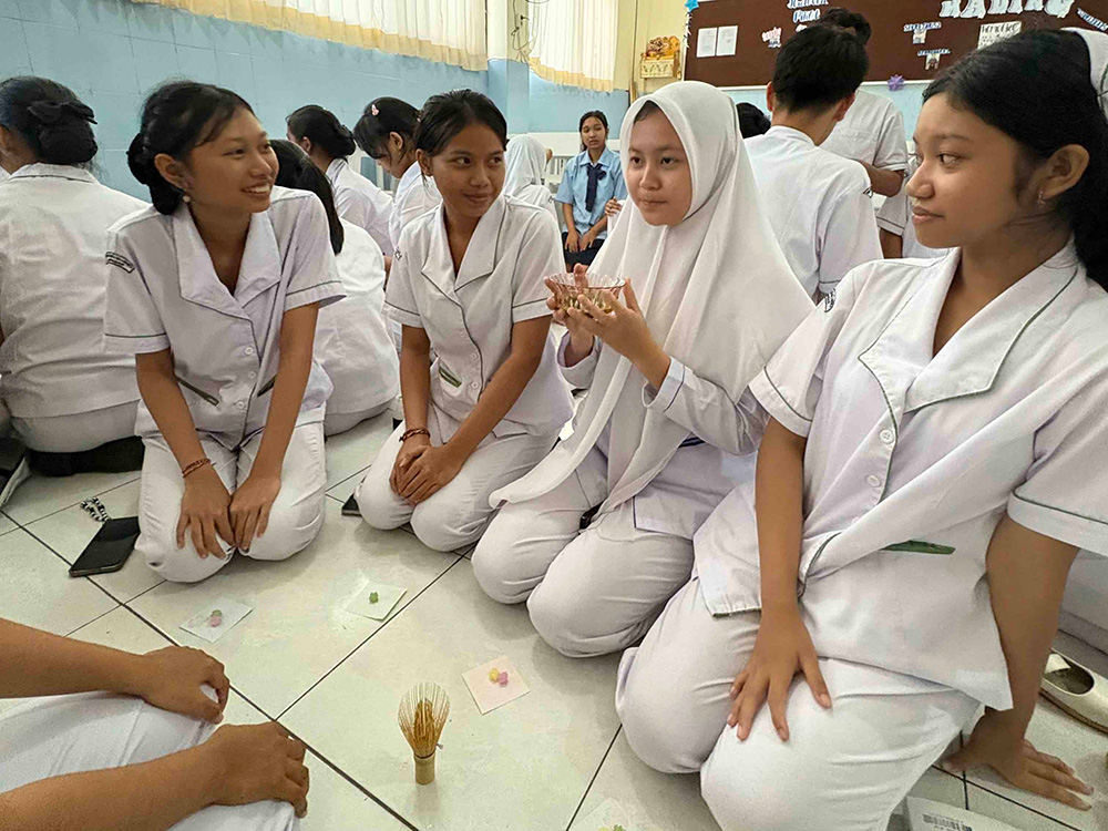 インドネシアでは抹茶が大人気です。CP先生(現地の日本語の先生)や生徒からリクエストがあり、日本語クラブで茶道を紹介することになりました。私は茶道について詳しくなく、本格的なことはできません。それでも、茶道を通じて生徒に一番伝えたいことは何かを考えました。