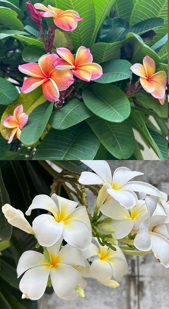 よく目にするのが、プルメリア。白やピンクの花びらが風に揺れる姿は、本当に息をのむほど美しく、見ているだけで気持ちが和らぎます。